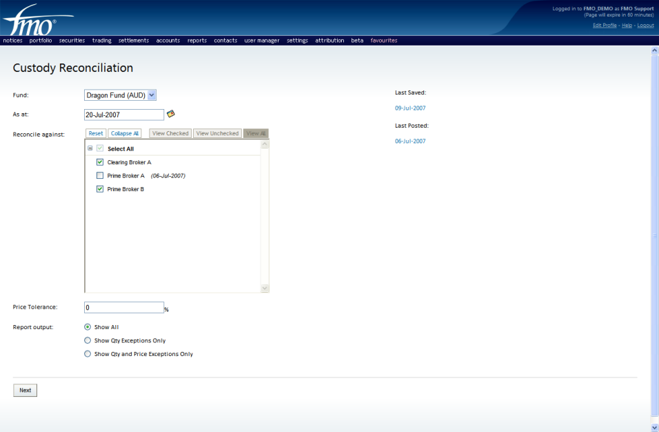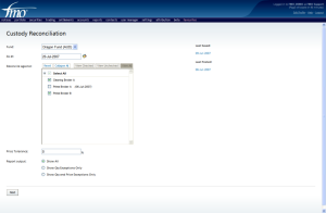 FMO enables clients to prepare custody and bank reconciliations, either manually or by importing the Prime Broker’s position and cash files for automatic matching.