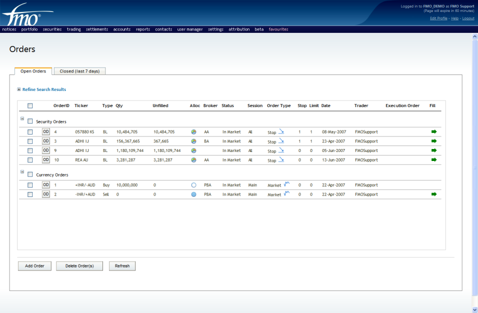 Trade recommendations are created as orders which can be managed in the FMO Order Management System (OMS).